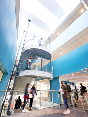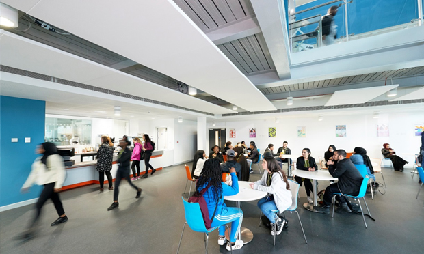 Being London’s largest six form college with approximately 2,500 students, a wider entrance has been constructed to enable better security and management of the “tidal” flow of people entering leading into the spacious hallway called ‘the Link’. This is the hub where exhibitions and events take place.