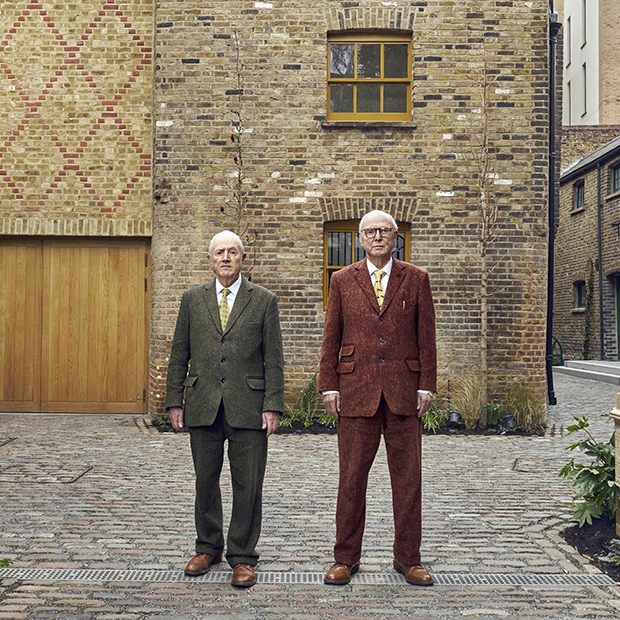 Gilbert & George in the courtyard of The Gilbert & George Centre. Photograph: © Tom Oldham / courtesy The Gilbert & George Centre