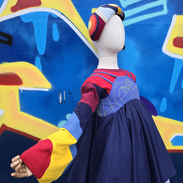 For the last few months, the Philadelphia-born couturier has been displaying her collection of upcycled garments at the Octopus Club on the upper deck of the Young V&A. Her ‘brand’, Generation Upcycle, brings new life not simply to old garments, but to the meaning of the word homespun.