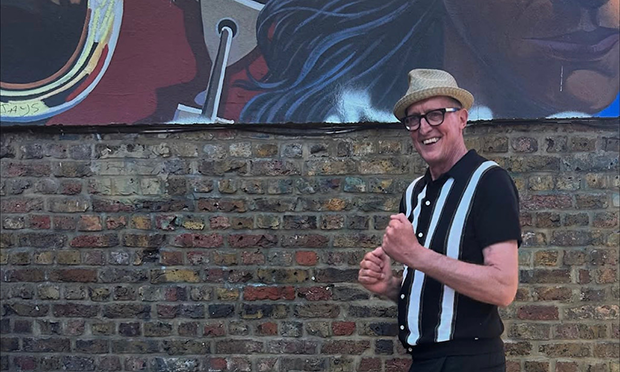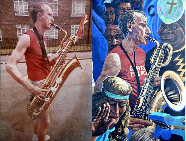 Alan May pictured by the mural in which he features. Image: courtesy: Hackney Archives